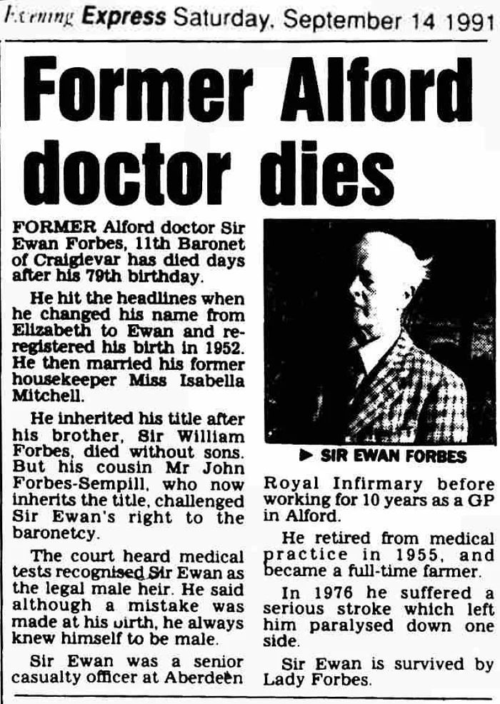 After moving to Aberdeenshire, Forbes-Sempill continued to publicly present himself as a man in his daily life. In 1952, he legally and formally became male by requesting a warrant for birth re-registration and changed his name to Ewan. He announced this change with a short notice in the Aberdeen Press and Journal in September 12th, 1952: “Dr E. Forbes-Sempill henceforth wishes to be known as Dr Ewan Forbes-Sempill”. He was reportedly very candid with the curious press. He described his situation as, “a ghastly mistake. I was carelessly registered as a girl in the first place, but of course, that was forty years ago ... the doctors in those days were mistaken, too ... I have been sacrificed to prudery, and the horror which our parents had about sex.”